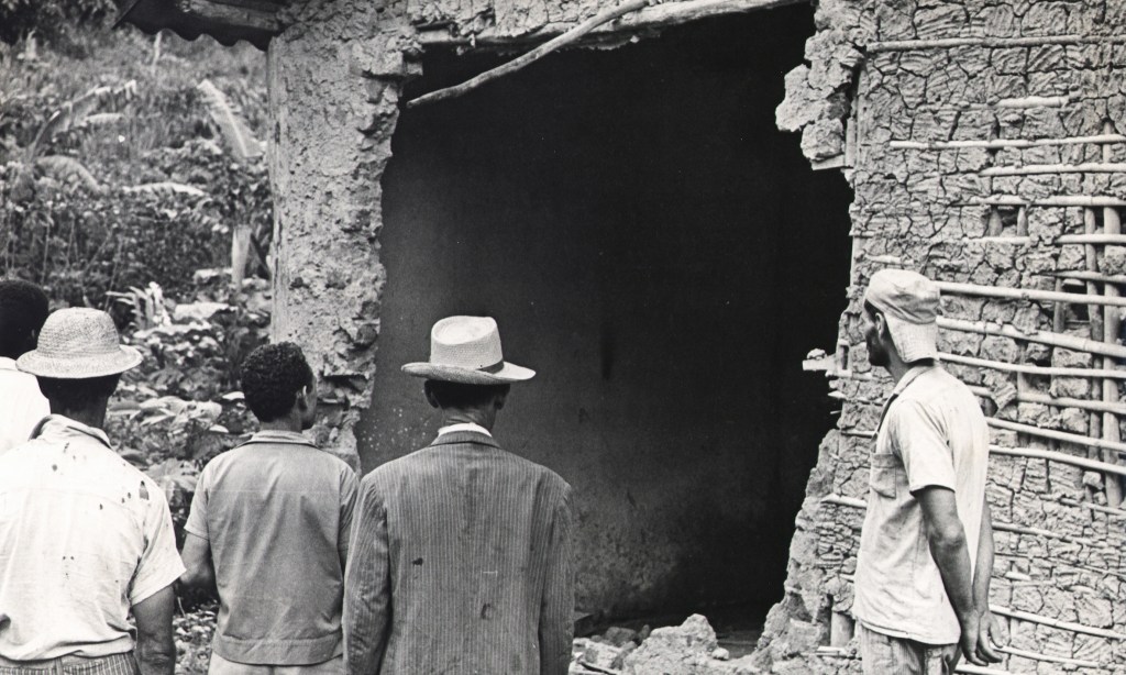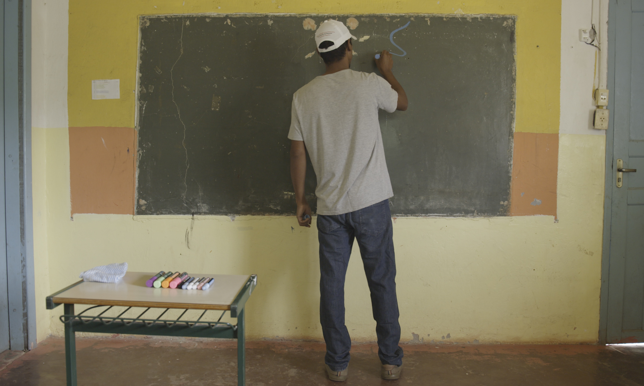 “na foto, uma faixa onde se lê: ‘luta-se pela terra livre’. um quadro negro com marcas do tempo se torna um mapa coletivo feito pelas pessoas que resistem. ‘quem de direito’ mobiliza uma série de recursos e arquivos para convocar memórias de luta pela terra. ao passo que as vozes ecoam o nome daqueles que foram presos em meio à resistência, águas, matas e a própria terra também contam a história da comunidade do vale do guapiaçu.”